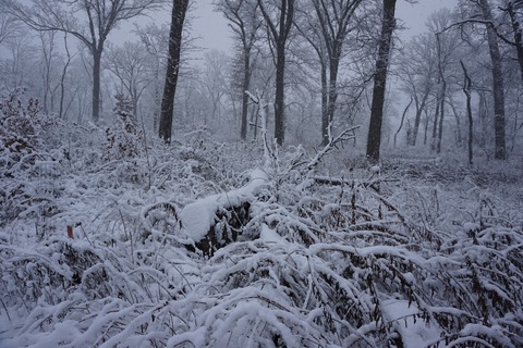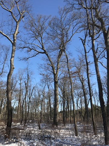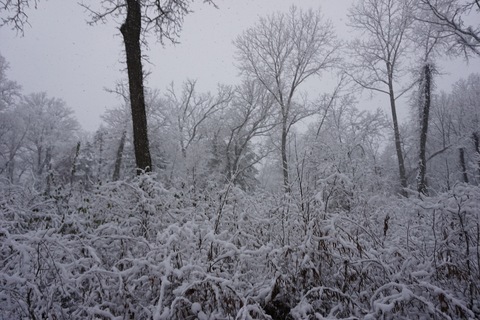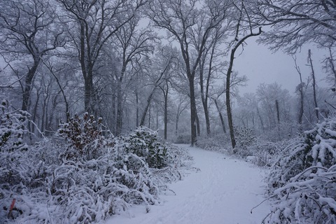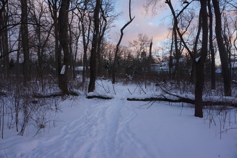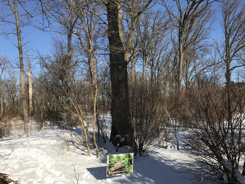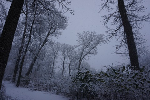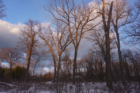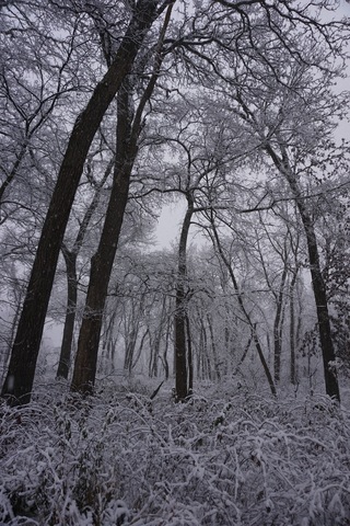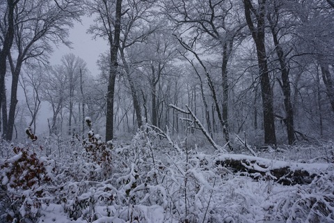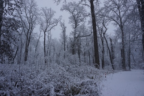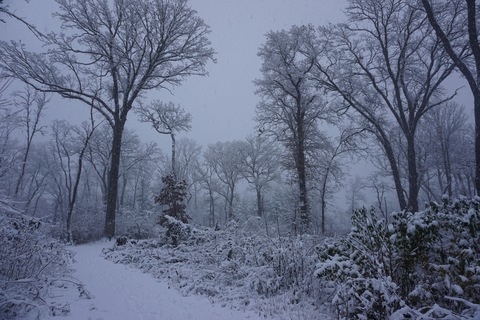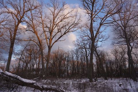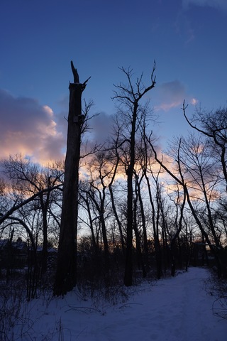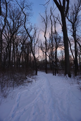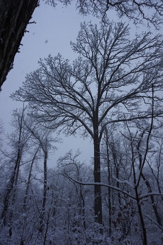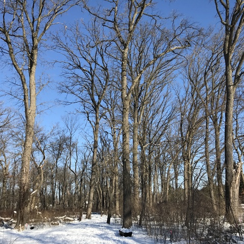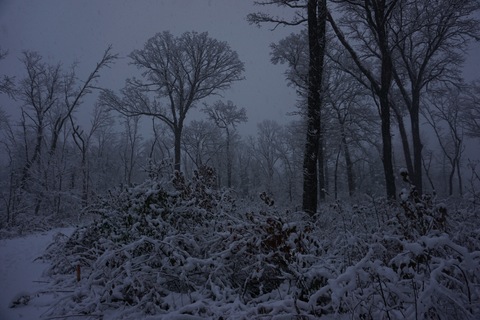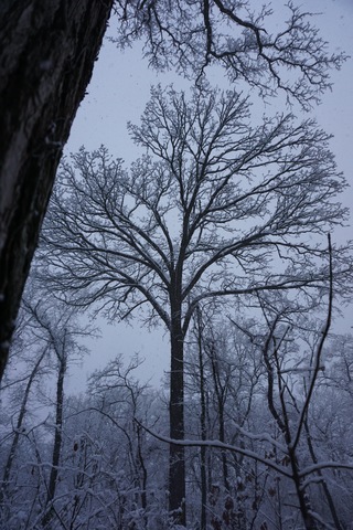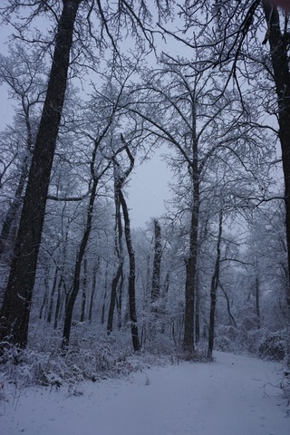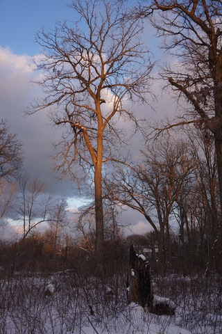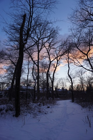 In winter, the woods are relatively quiet, but the trees can still be stunning especially when covered by snow, or illuminated by the morning and evening sun. In the evening, the hooting of the great horned owls echos through the woods. At the end of winter, often by March, the first wildflowers like Winter Aconite start to bloom.
